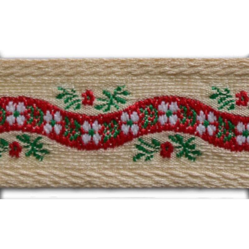 1 1/2" wide woven brocade ribbon with a wavy flowered red band through the center on a natural background, and with woven rope textured borders. Made in Austria. LIMITED STOCK.