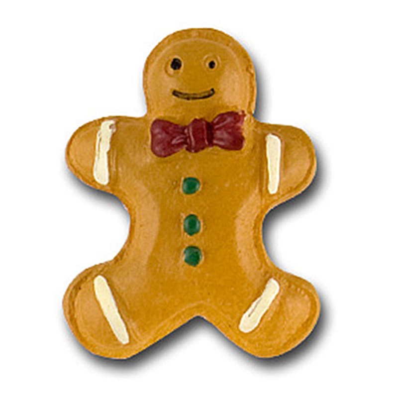 1 1/8″ smiling gingerbread person resin novelty button, with a red bowtie and green buttons. Made of resin. Plastic loop shank backing.
