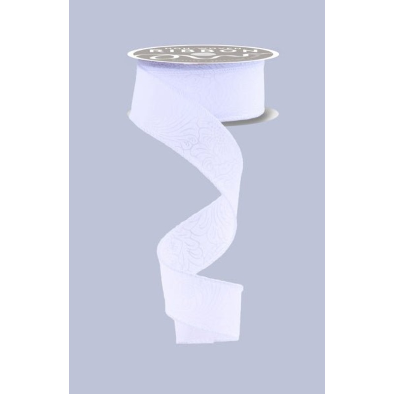 White ribbon with a floral pattern embossed into it.This ribbon is thinner yet nice and sturdy and is semi-transparent in the places where the lines of the embossment press into the ribbon. Almost like a thin plastic ribbon. 1.5" x 10 yards, wired.