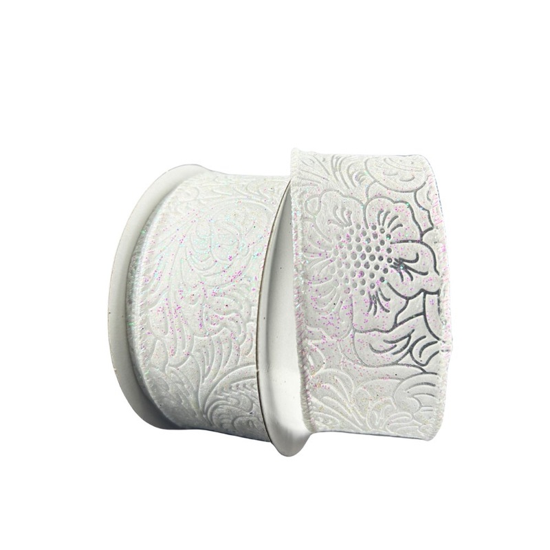 A 10 yard roll of 1.5″ iridescent glitter white ribbon with a floral pattern embossed into it.The wired edges make this ribbon perfect for shaping into bows. This ribbon is thinner yet nice and sturdy and is semi-transparent in the places where the lines of the embroidery press into the ribbon. Pretty ribbon for Christmas!