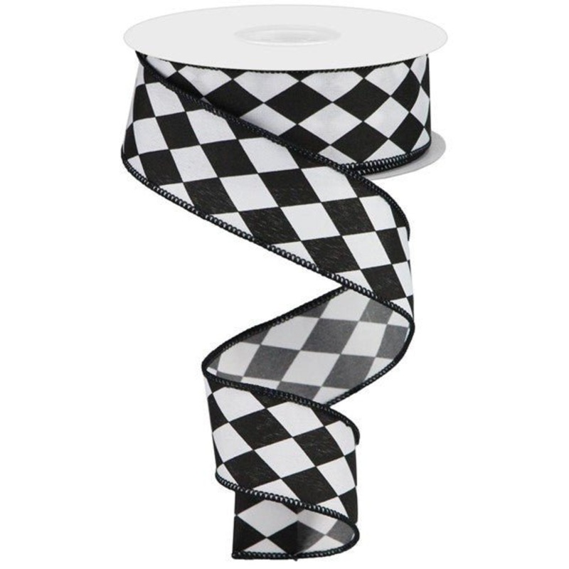 1.5" x 10yd roll of Black and White Diamond Harlequin pattern on pongee fabric ribbon. This ribbon is great for Halloween accents, or just a pop of black and white anywhere! The wired edges make this ribbon perfect for shaping into bows.