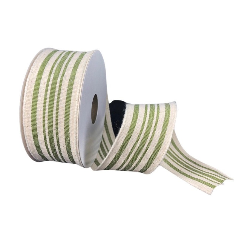 1.5" Ivory colored thick, woven ribbon with moss green French stripes. Great ribbon to use for Fall or spring bows and accents. The wired edges make it perfect for shaping into bows. 1.5" x 10 yard length, wired. 60% polyester, 40% cotton.