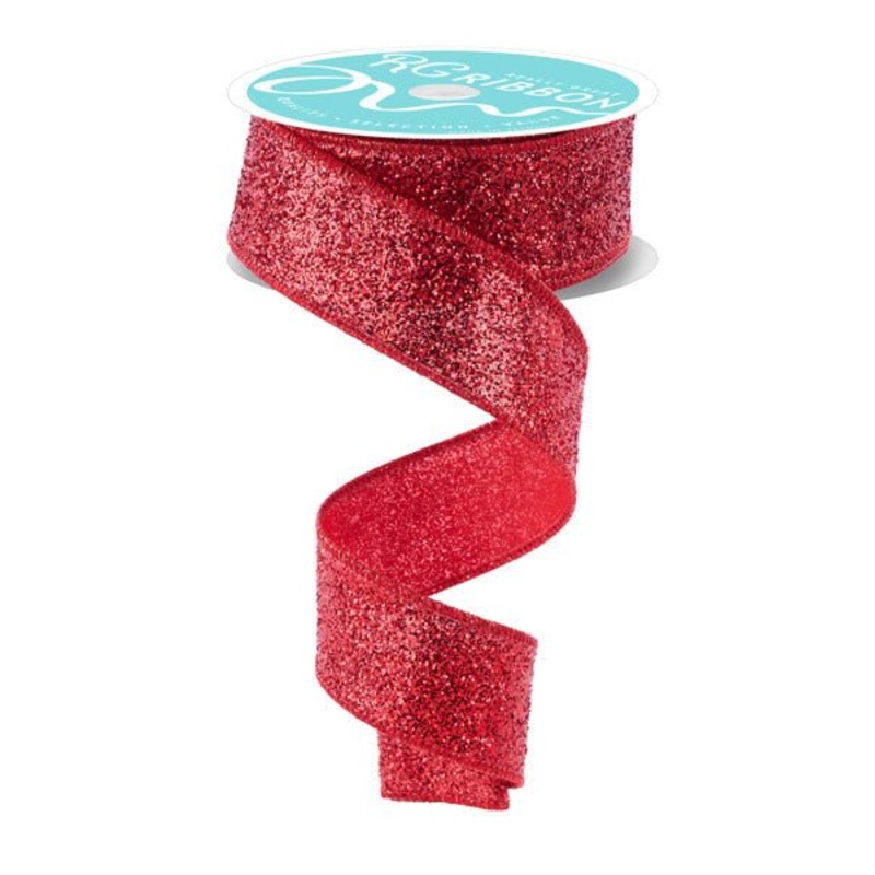 A 1.5 inch wide, 10 yard roll of red ribbon with laser glitter. Wired. Twist into a bow or add an accent to your wreath, garland, or other decor!