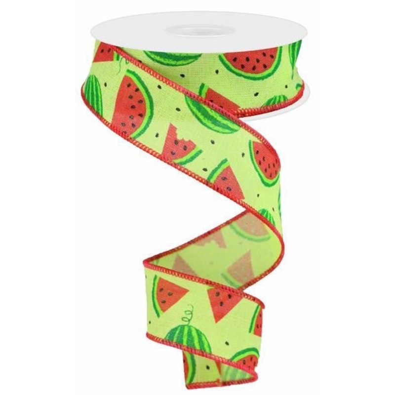 1.5" wide roll of linen ribbon with reddish pink and green watermelons and slices on a light green background. Wired, 10 yard length. Perfect for your summer watermelon wreaths and accents!