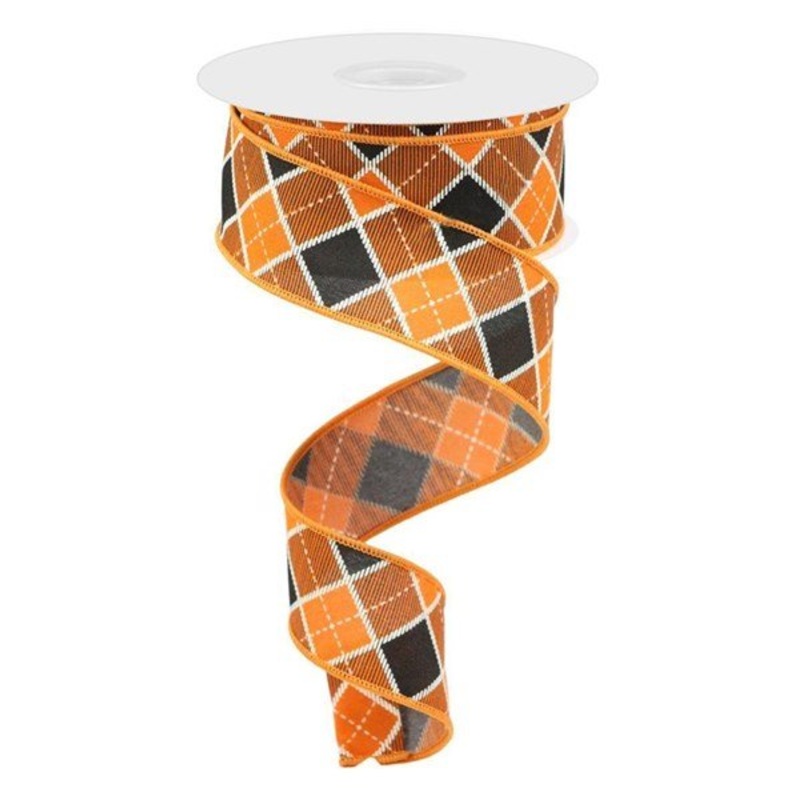 A 1.5" x 10yd roll of orange, black, and white diagonal check ribbon. Great ribbon for Halloween bows and accents! Use to make wreaths, bows, for gift wrapping, or decorate your tree or mantle!