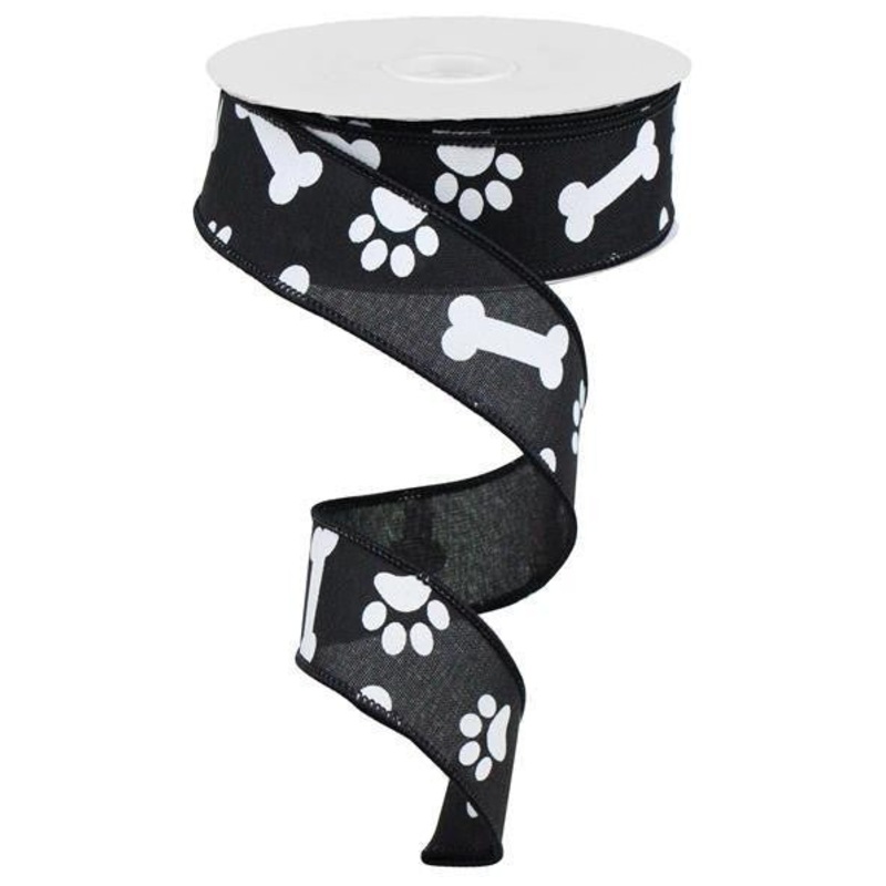 1.5" X 10Yds Wired, black linen ribbon with white paw prints and dog bones. Perfect for dog themed decor and accents!