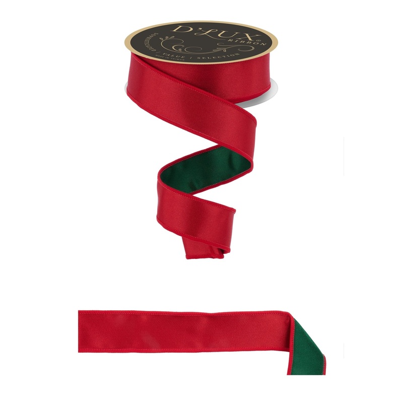 Red satin ribbon fused with solid emerald green satin on the back. 1.5" x 10YDs with strong wire edge. Perfect ribbon for Christmas bows and accents!