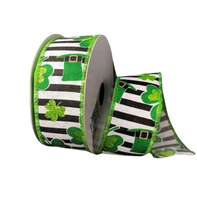 A roll of white with black stripes linen ribbon with green and lime glittered shamrocks and green top hats. Wired, 1.5" x 10YDs. Perfect for St. Patrick's Bows and Accents!