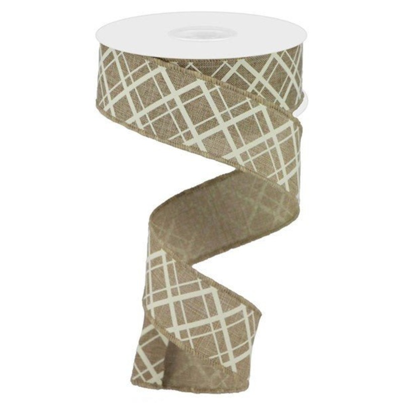 A 1.5" x 10yd roll of light beige linen ribbon with thick and thin ivory colored diagonal check lines. Great ribbon for fall bows and accents! Use to make wreaths, bows, for gift wrapping, or decorate your fall florals or mantle!