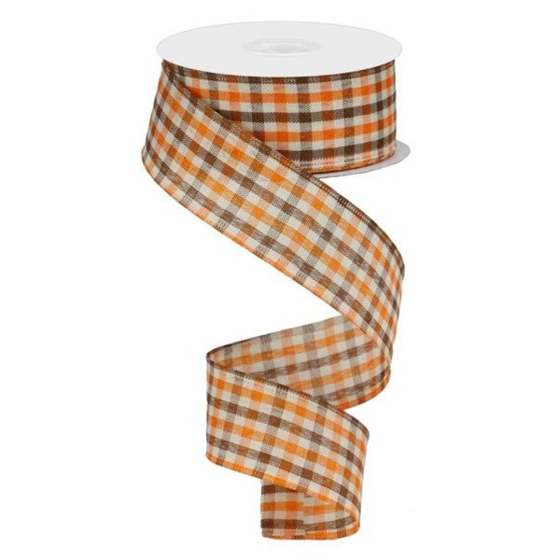A roll of orange, brown, and ivory gingham checked ribbon, wired. 1.5" x 10YDs. Great ribbon for fall accents. Wired edges make this ribbon perfect for shaping into bows.