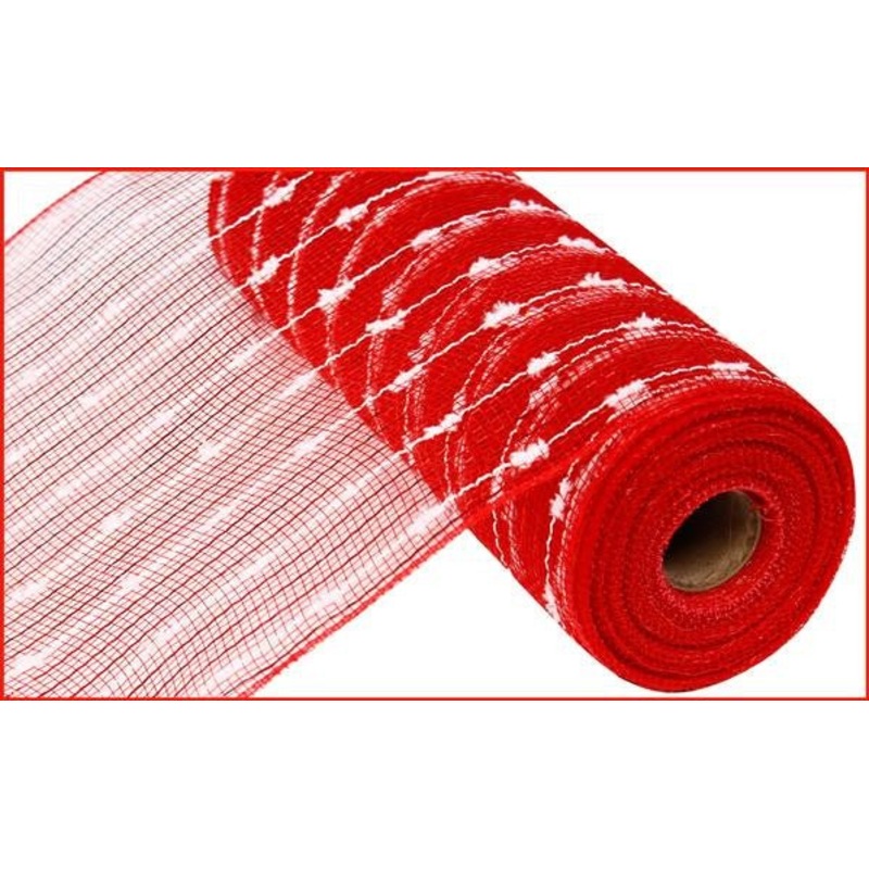 A 10.5" x10 yd roll of synthetic red metallic deco mesh with white strands of fuzzy pom pom string that resemble white snowballs. This new style of deco mesh has great texture and works well for Christmas or winter inspired themes.