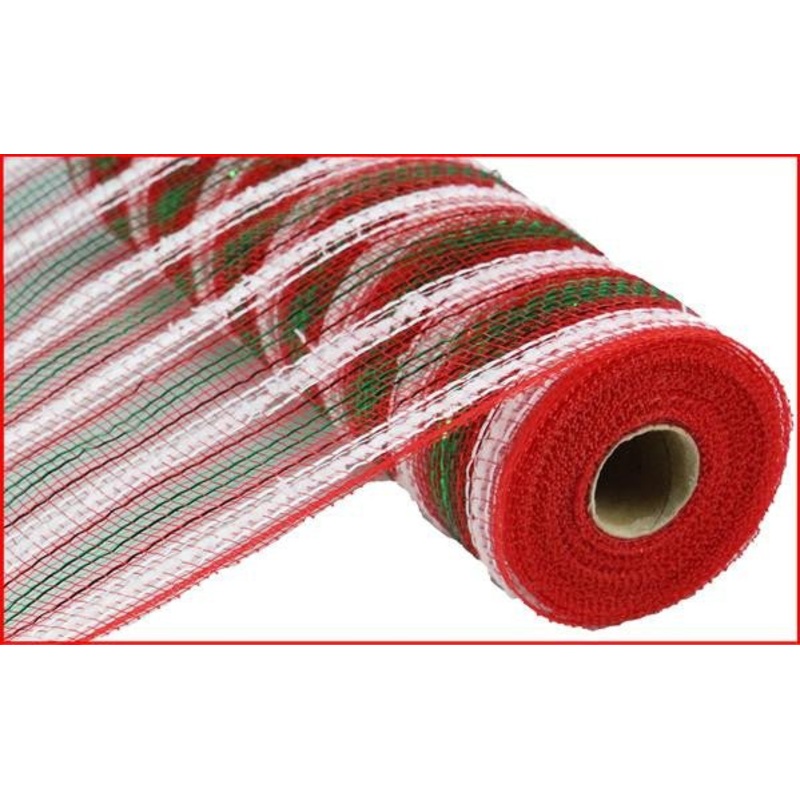A roll of 10.5 inch X 10YD Red Metallic Deco Mesh with white cotton drift lines and thin metallic emerald green stripes.Use to make wreaths, garland, decorate trees, wrap gifts, make bows, etc! This color of deco mesh is perfect for Christmas wreaths and a