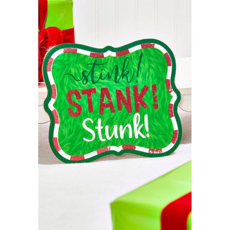 Add a sparkle to your Christmas decor with our 10.5" Stink Stank Stunk Glitter Sign! This green glitter-covered sign with red and white around the edges is sure to make your holiday season extra merry and bright. Featuring the phrase "Stink Stank Stunk" it