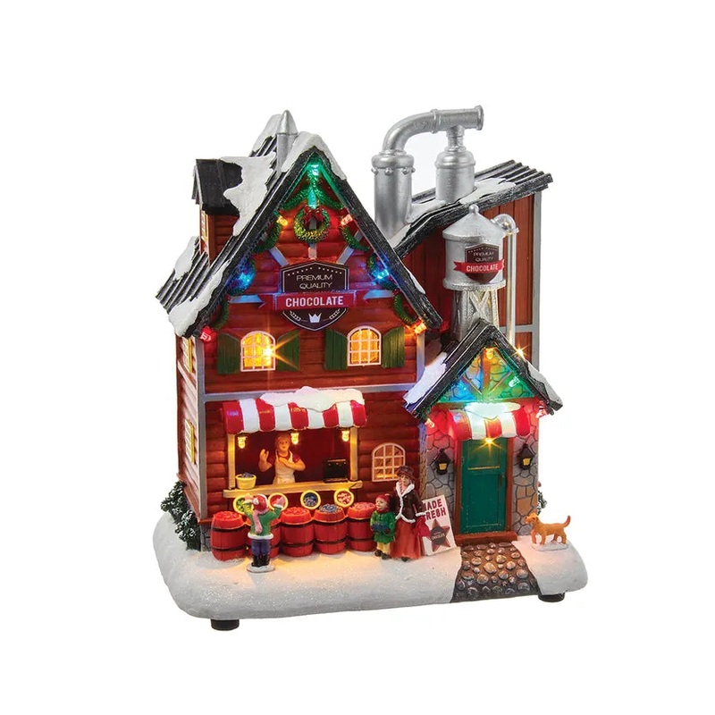 This 10.63-Inch Battery Operated Light-Up Musical Chocolate Factory Table Piece is a fun and festive addition to any home or office holiday dcor. This musical table piece is the perfect addition to your Christmas village collection. When turned on, 8 different Christmas tunes play and the chocolate factory lights up beautifully.