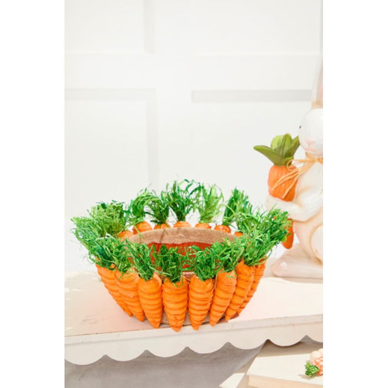 Bring farmhouse charm home with this 10" Carrot Basket! This smaller Carrot Basket measures 10" wide and is 6" tall. It is sure to become a showstopper in your kitchen or dining room. Its vibrant orange carrots and whimsical greenery pop against the basket