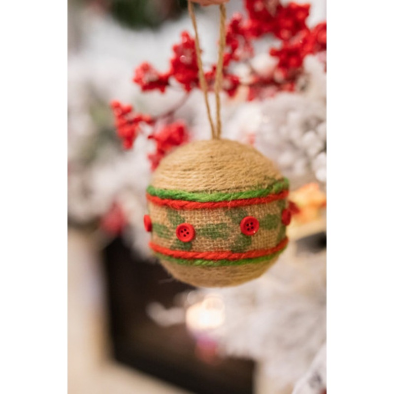 Embrace a rustic Christmas theme with natural jute ornaments from Decorators Warehouse! This 10-centimeter jute ornament pairs well with other jute ornaments of varying sizes. They make perfect gifts for those who appreciate the hand-made aesthetic and natural material. Petite red buttons are sewn on to represent holly, and the entire sphere is finished off with red and green threads. Ideal for a rural holiday tree!