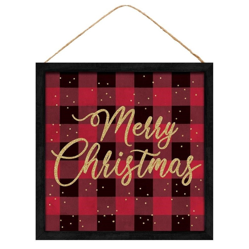 Final Sale 10" Square Merry Christmas sign in red and black buffalo check with gold print. This sign is made of mdf with adhesive sticker. Great addition to your Christmas wreaths or tree, or add a coordinating bow and hang!
