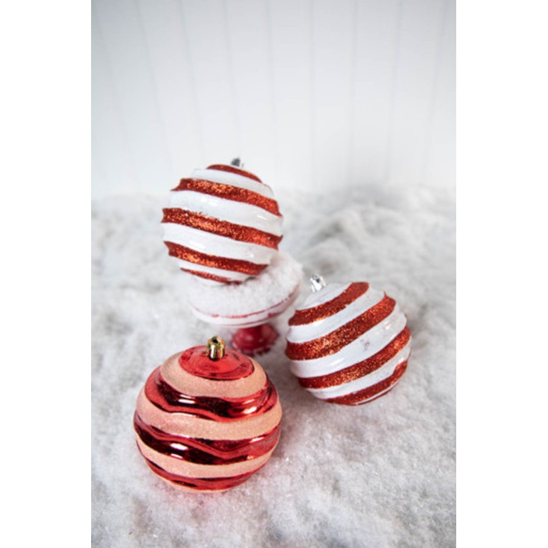 Add a pop of color and sparkle with this set of 3 red and white striped ornaments. These peppermint-theme dazzle on Christmas trees, garlands and wreaths. The ornament set pairs exceptionally well with items in our North Pole Party collection or Peppemint and Gingerbread collection.