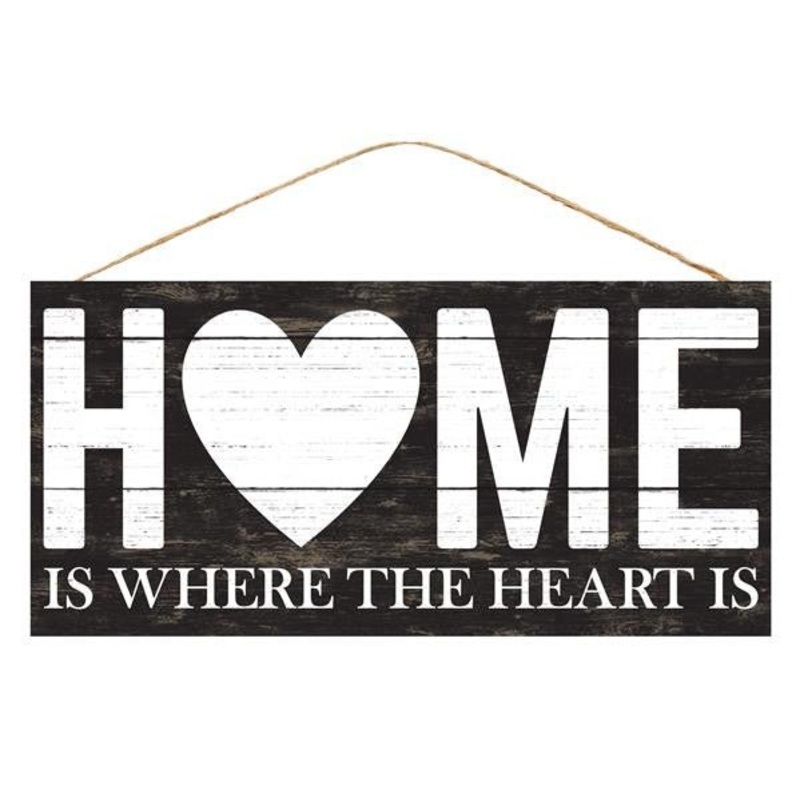 12.5" Rustic wooden "Home is Where the Heart is" sign with a black and white distressed print. This sign is made of mdf with a printed adhesive sticker. Great sign for an everyday wreath. Measures 12.5" x 6"