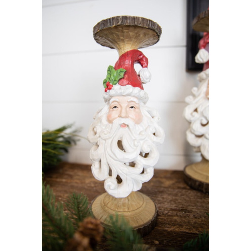Add an old-world charm to your holiday decor with this 12.5 Resin Santa Head Wood Cutout Beard Candle Holder. This unique design features a filigree-like wood cutout detail and red-and-white Santa head on a neutral base. Place votive in the round cutout at the top to transform this piece into a festive candle holder. Perfect for any home or holiday display! Pair with our 15.5 Resin Santa Head Wood Cutout Beard Candle Holder for a great gift set!