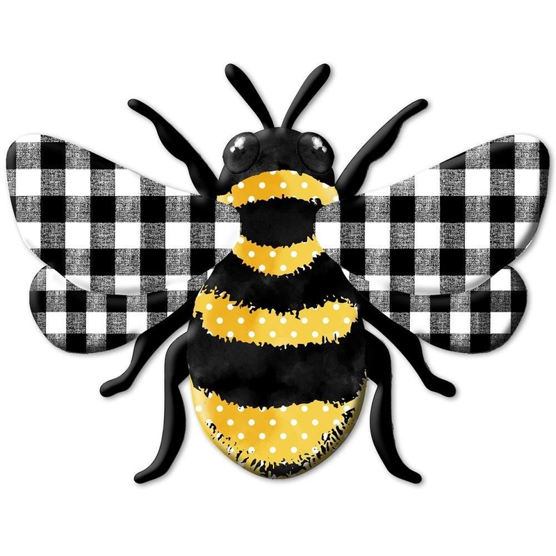 12" Embossed metal bumblebee with small white polka dots and black and white check wings. Made of heavy duty metal with attached sawtooth picture hanger on the back. Cute addition to your Bee themed wreaths and decor! Measures 12" x 9.25".