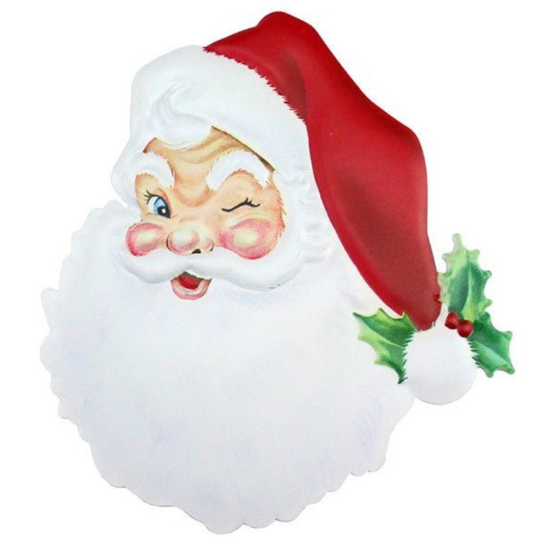 12" embossed metal Santa face with rosy cheeks holly on his hat. Made of heavy duty metal with attached sawtooth picture hanger on the back. Cute addition to you Christmas wreath or decor! Measures 12" x 11.75".