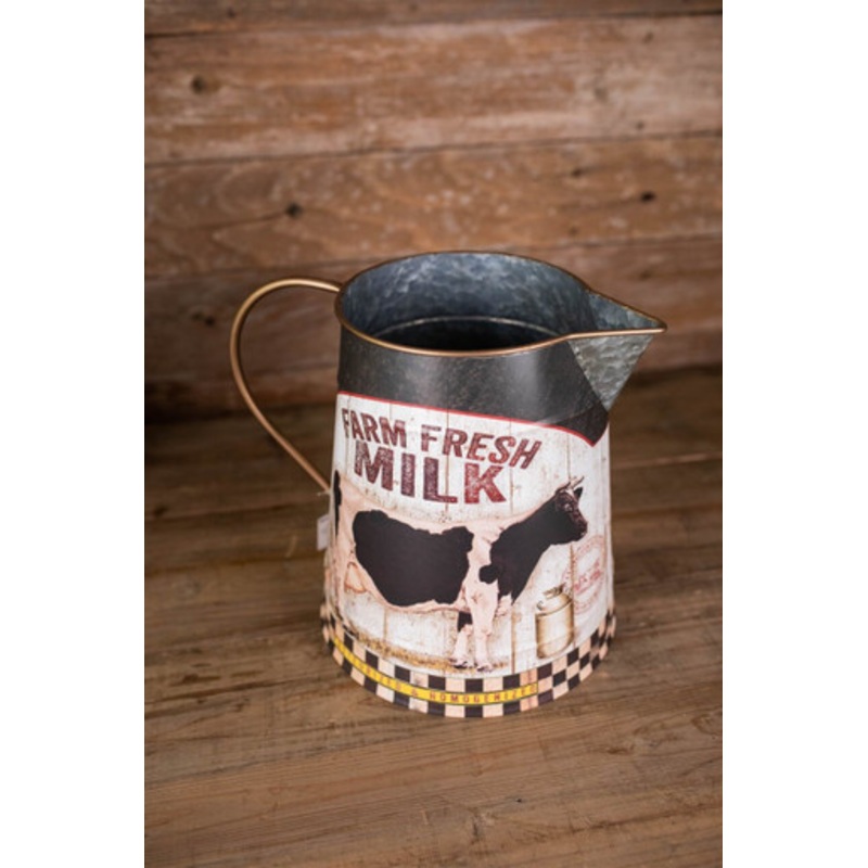 Charming on its own or filled with fresh flowers, our metal farm fresh can is highly versatile. The vintage "farm fresh milk" can has a galvanized metal surface complete with a modern bronze rim. Use to add dimension to any shelf, kitchen, or patio.