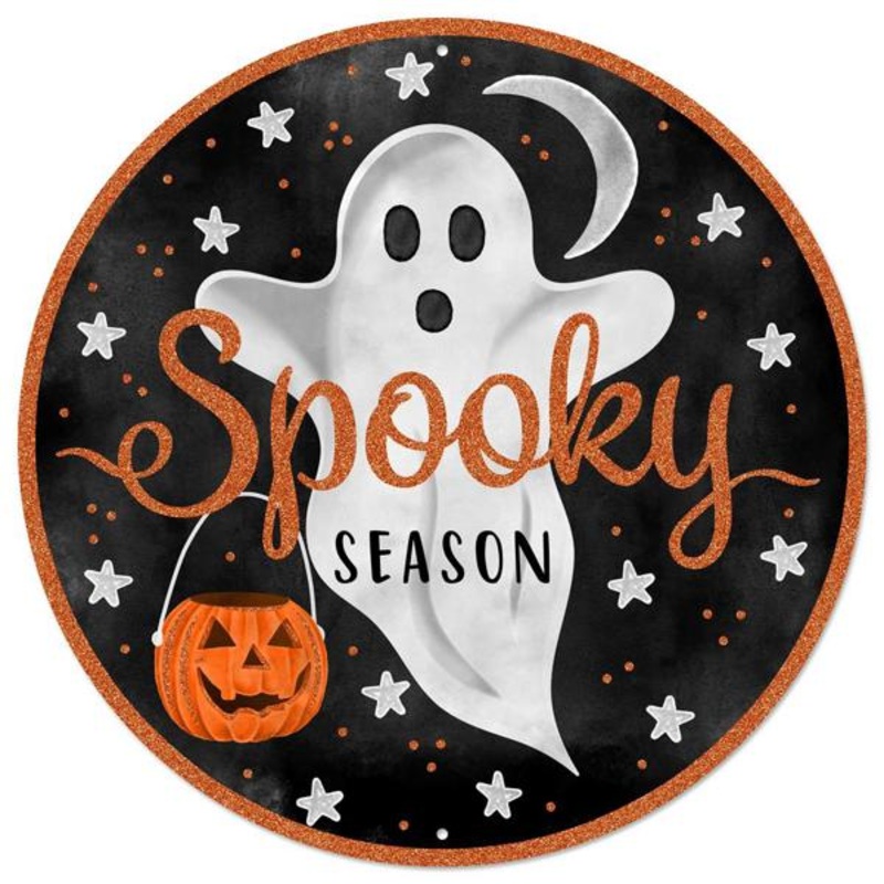 12" Round Metal Halloween sign with "Spooky Season" wording and ghost with a pumpkin all ready for Trick or Treating! Orange glittery lettering and border. Fun addition to a Halloween wreath.