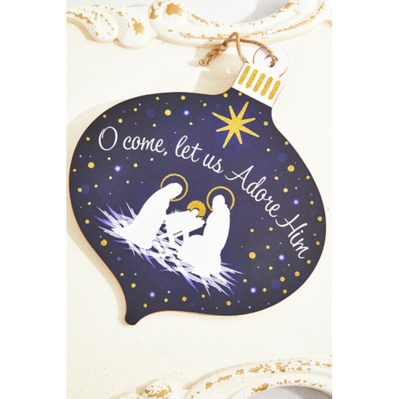 Elevate your holiday decor with our 12" x 10" Navy, White, and Gold Finial Ornament Sign, bearing the timeless message, "O Come Let Us Adore Him." This striking sign blends rich navy and opulent gold accents, evoking a sense of reverence and wonder, and it