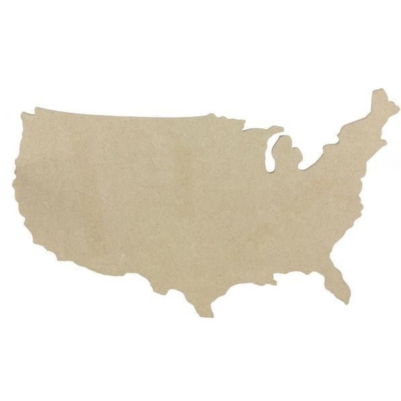 14.5" x 9" MDF cut out of United States of America outline, unfinished. The possibilities are endless with this sign! Paint any color/design, and use for a wreath centerpiece. Use for a school project or craft.