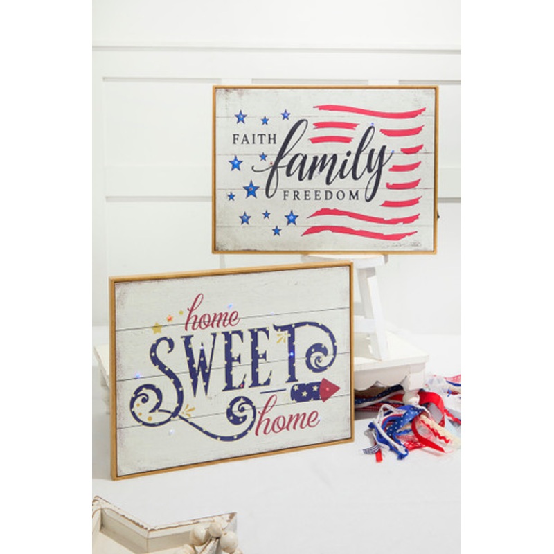 These two 15.75"L Battery-Operated Lighted Wood Americana Wall Signs beautifully showcases patriotic charm with rustic wooden design and built-in lighting. Perfect for adding a warm glow to your Fourth of July, Memorial Day, or everyday Americana decor, th