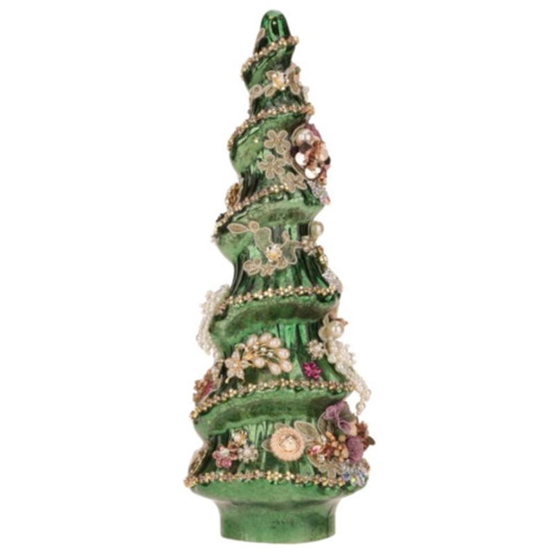 The 15" Green Jeweled Christmas Tree by Mark Roberts is a radiant centerpiece that brings elegance and sparkle to your holiday dcor. Designed to resemble a vintage glass tree, it features intricate faux jewels, pearls, lace, and floral accents, creating a
