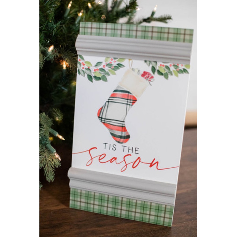 This sage and forest green plaid theme, accented with deep red, provides a more neutrally-based aesthetic to the traditional color scheme. Utilize this sweet sign in fireplace or entryway displays for simply nostalgic and designer impact.