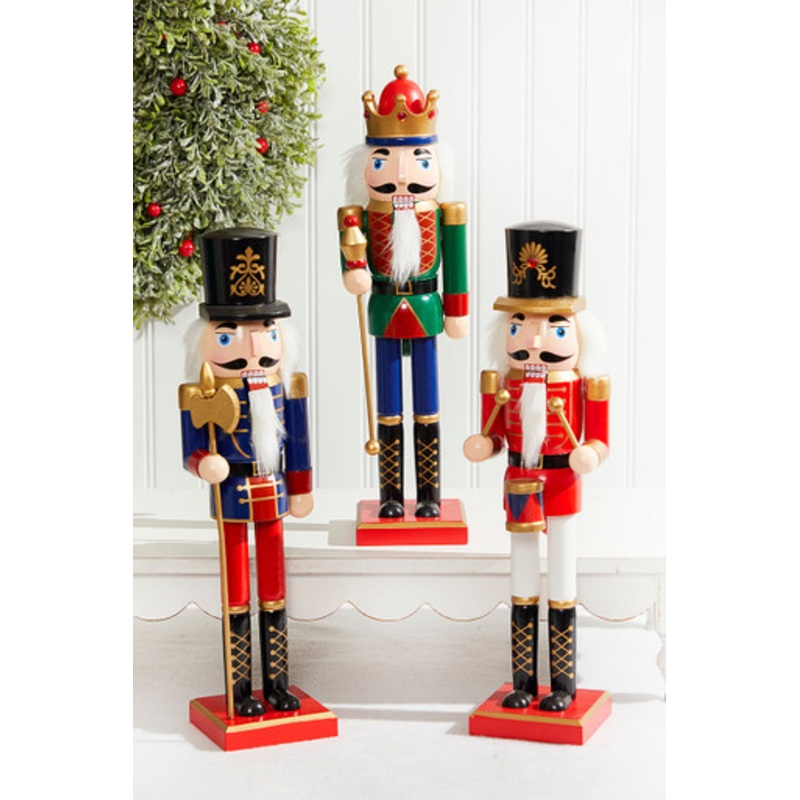 Bring timeless holiday elegance to your home with our 15 Traditional Nutcracker collection. Crafted in vibrant shades of red, blue, and green, these charming nutcrackers are each armed with their own symbol of holiday spiritone proudly carries a regal staff, another brandishes a mighty weapon, and the third beats a joyful drum. Sold individually but available in three unique designs, these hand-painted figures add a touch of festive flair to any room. Whether as a trio or on their own, theyre sure to bring cheer and elegance to your seasonal decor. ***Please note: Not sold as a set unless the ‘BUY SET’ option is chosen.