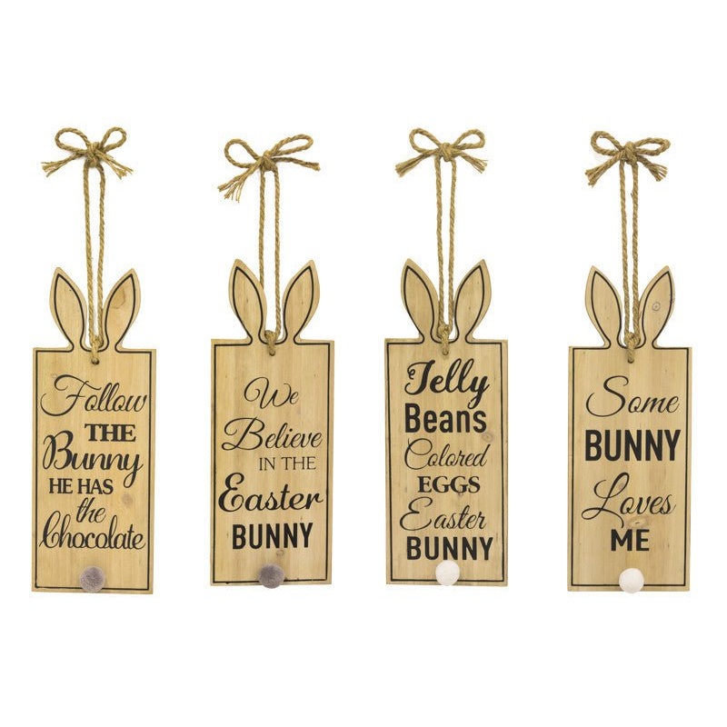*Final Sale* 16" Wood tag signs with bunny ears and cotton tail, available in 4 different saying, sold individually. Great addition to an Easter wreath! Select saying: Follow the Bunny He has the Chocolate; We Believe in the Easter Bunny; Jelly Beans Color
