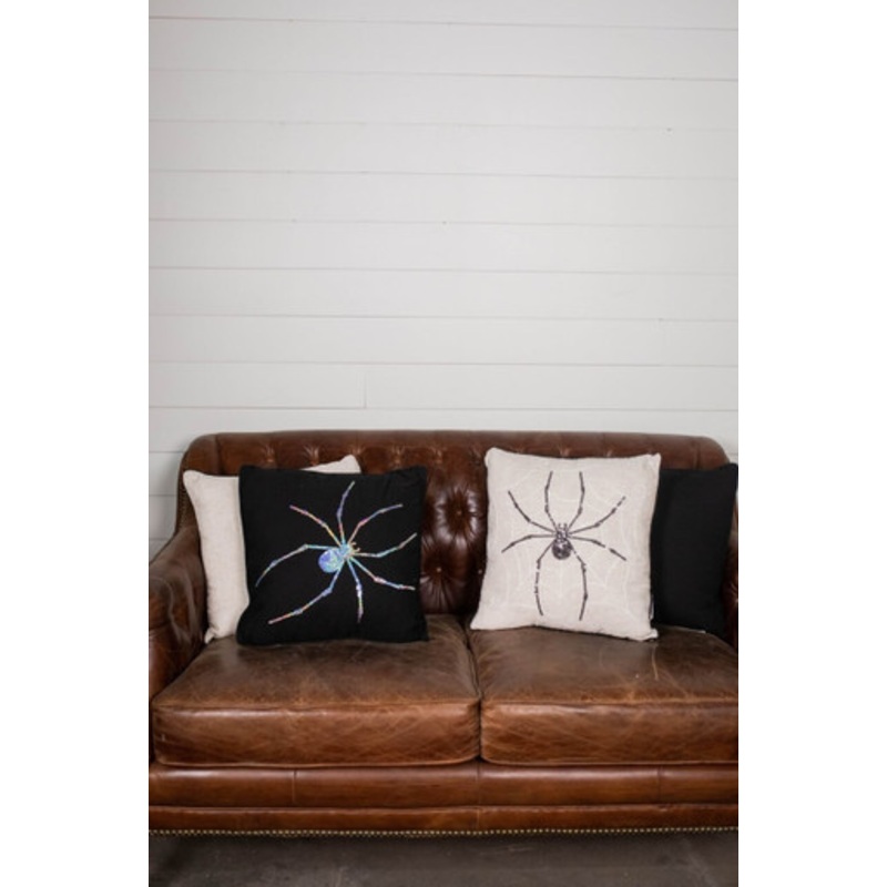 The blunt color-contrast on our intriguing spider pillows will allow these accents to stand-out as they adorn your furniture for the Halloween season. Available in two complementing styles, the glittery spiders give these pillows an upscale feel.