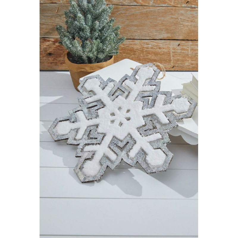 Add a statement piece to your holiday decorations with this 17.5 Hanging Snowflake Ornament. The white frosted snowflake is outlined in grey detail for a sophisticated look. Hang this oversized ornament from your tree or in a window for a stunning visual effect. Perfect for adding a touch of wintery elegance and rustic decor to your home.