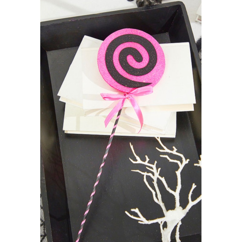 Add a playful touch to your Halloween decor with our Lollipop Pick. Featuring vibrant black and pink swirls, this whimsical pick is accented with a pink ribbon for a festive flair. Perfect for your Halloween tree, wreaths, centerpieces, or floral arrangements, it brings a sweet and spooky charm to any setup. Enhance your Halloween decorations with this delightful Lollipop Pick!