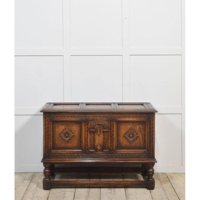 17th Century-style carved oak coffer, the hinged lid over a triple panelled arch front, below a dentil frieze on turned legs united by stretchers. Dimensions Height 28.5 Inches Width 42 Inches Depth 17 Inches Design Period 1890 to 1919 Production Period 18
