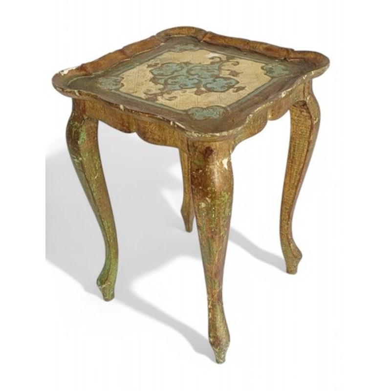 Rococo Florentine Revival 1950's Gilt Bedside Accent Side Table, Italy. Charming Mid-Century Modern side table in a lovely light tourquoise color with original gilt gold finish. Certainly elegant standing alone or next to a sofa or used in a bedroom. Wonde