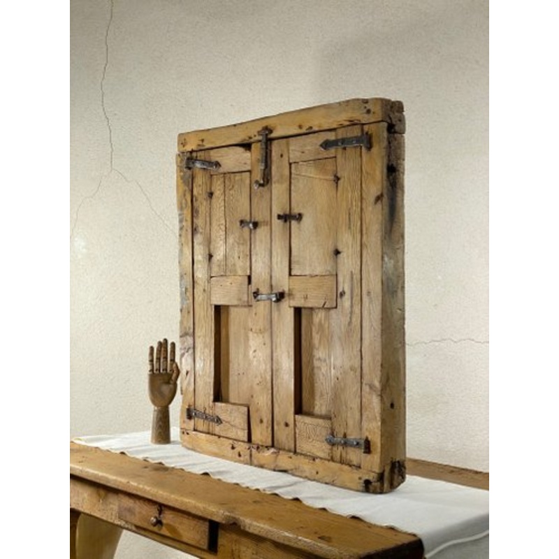 Castilian window made of thick pine wood, 18th century.Each leaf has a small window or peephole.It retains all the original forging hardware, hinges, latches, etc...It maintains its original frame, therefore, it is ready to be installed.Washed and treated
