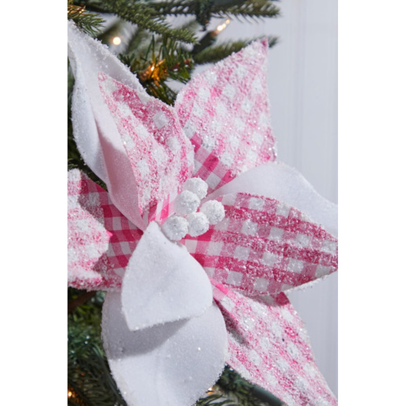 Add a dash of whimsical charm to your Christmas decor with our 19" Pink & White Checkered Poinsettia Pick. This holiday essential captures the spirit of the season, invoking cozy feelings of warmth and joy with its playful color palette. Brighten your fest