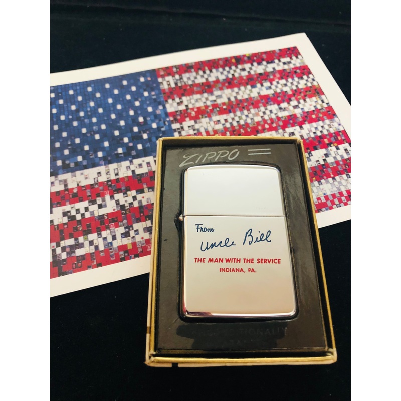 Uncle Bill - The Man with the Service - Indiana PA. This 58 year old Zippo lighter is high polish 2 color etch & paint in fantastic condition. The insert and inside body is very clean, unfired, not a blemish to be found. We grade this lighter Gem Mint 100.