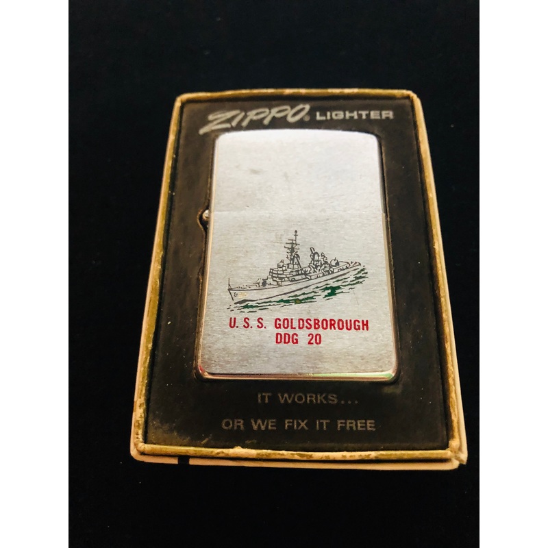 USS Goldsborough was deployed on the Vietnam Gun line several times and participated in the Apollo 11 recovery mission. 1968 Double-Sided Zippo in Very Good 85 condition. This used US Navy lighter is in Very Good condition with very light scratches and one