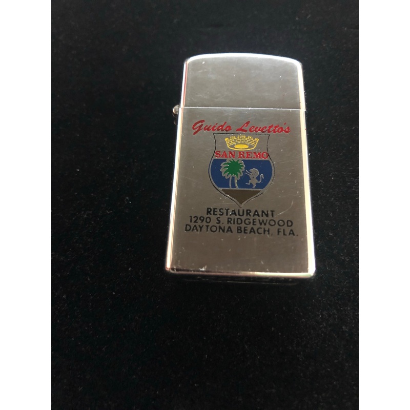 1973 Slim Zippo SIX COLOR Etch & Paint Advertiser Lighter - Guido Levetto race cardriver at Daytona 500 in 60s-70s. Daytona Beach San Remo Restaurant. This lighter represents a great 6-color advertiser used by a race car driver for his restaurant in the ea