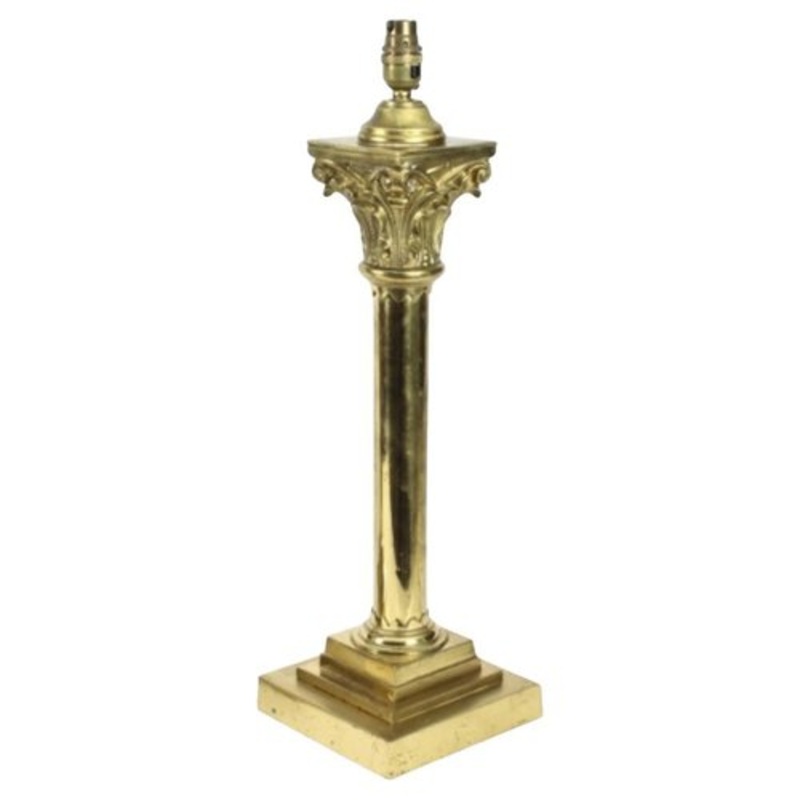 This is a splendid pair of antique Victorian brass columnar Corinthian column table lamps, now converted to electricity from oil lamps, late 19th century in date. This opulent pair of antique table lamps feature Kingly Corinthian Capitals decorated with classical ornate foliage in the form of splendid acanthus leaves above striking shafts. They stands on large and weighted stepped square bases. Add an element of Greek Classical style to your home with this exquisite pair of antique table lamps. Provenance: Property from The Manor House, Stanford in the Vale Condition: In excellent working condition having been beautifully cleaned and rewired, please see photos for confirmation Dimensions in cm: Height 56 x width 16 x depth 16