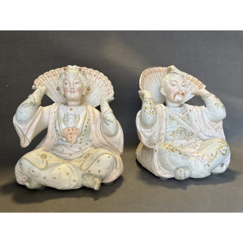 * 2 biscuit porcelain figurines of a man and a woman, each with a “nodding” head. Both the man and the woman sit cross-legged and dressed in elaborately decorated Far Eastern costumes.