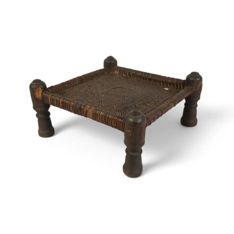 Very rarely and unique 19th century antiquity chair low stool from Nuristan Afghanistan / Swat-valley Pakistan.Object: low stoolMaterial/technique: Wood, hide / hand-craftedOrigin/Period: Afghanistan, Nuristan / 19 th C.Width: 46 cmHeight: 20 cmDeep : 46 c