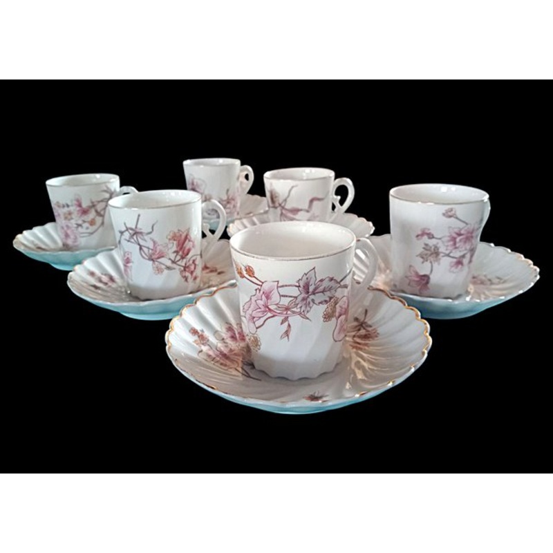 6 torso model coffee cups created by Haviland and available in many designs. Here a naturalistic decor specific to the Art Nouveau period of the late 19th or very early 20th century with flowers, foliage and insects in flight. Diameter of saucers 12.5 cm C