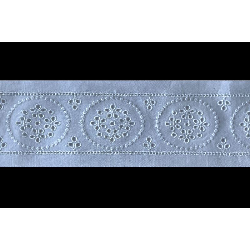 2 1/4″ wide white insertion lace trim with a center row of eyelet flowers in a ring. flanked by two narrow rows of faggoting. Raw edges. 100% cotton. Made in Switzerland.